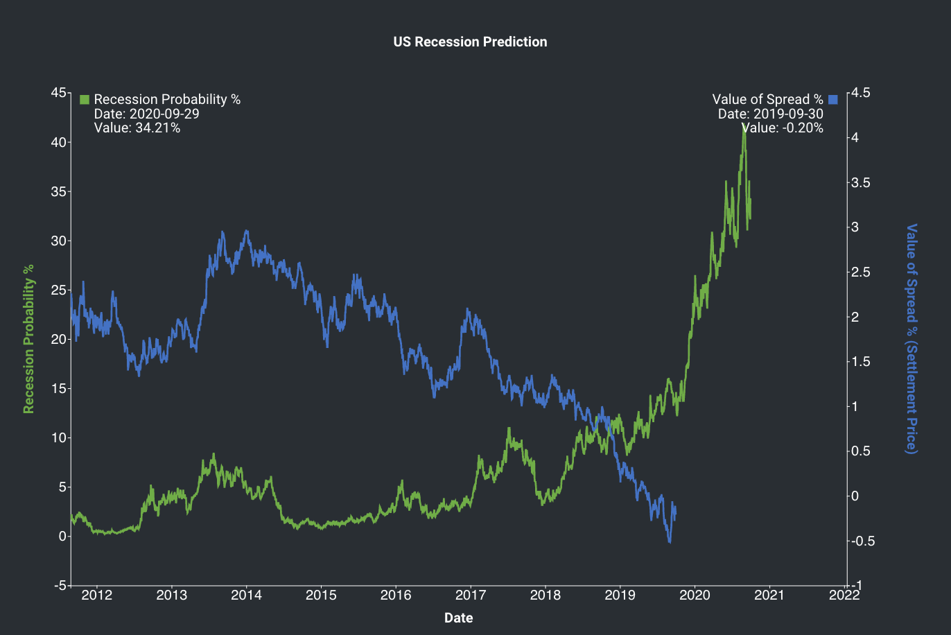 The ‘U.S. Recession Prediction Model’ uses data on the U.S. yield curve spread to predict the likelihood of an imminent recession. The model draws the data of past probabilities based on the U.S. yield curve spread with each yield curve fitted to a probability of predicting a recession in the next 12 months.